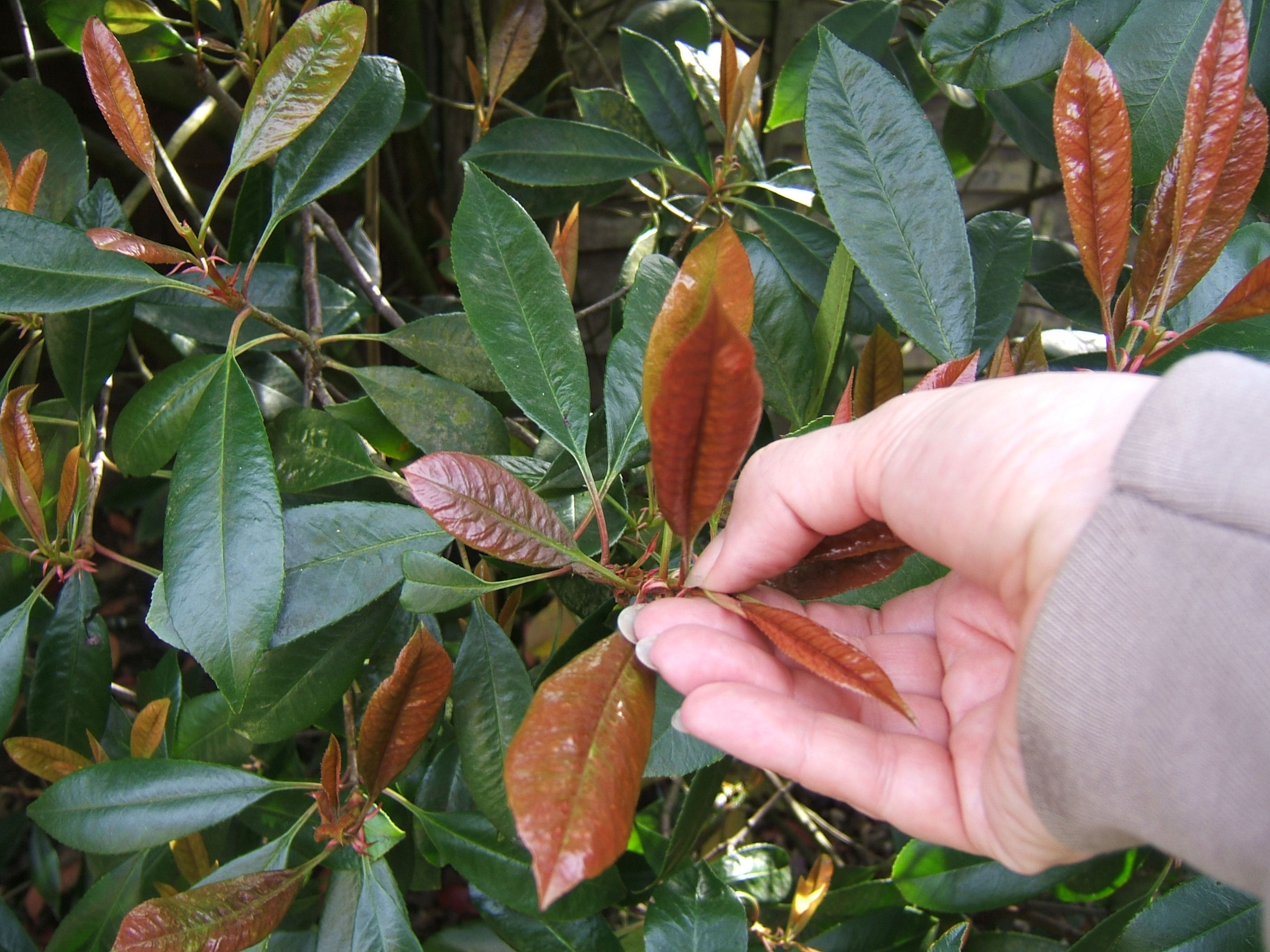 At this time of year, just as the new growth is coming through, you have to pinch out the tops of all the new growth. It is a time consuming and painstaking job, but creates a lovely compact bushy plant. As I do it, I always think of the people doing this to tea bushes, only I don’t fancy making tea out of a photinia :).