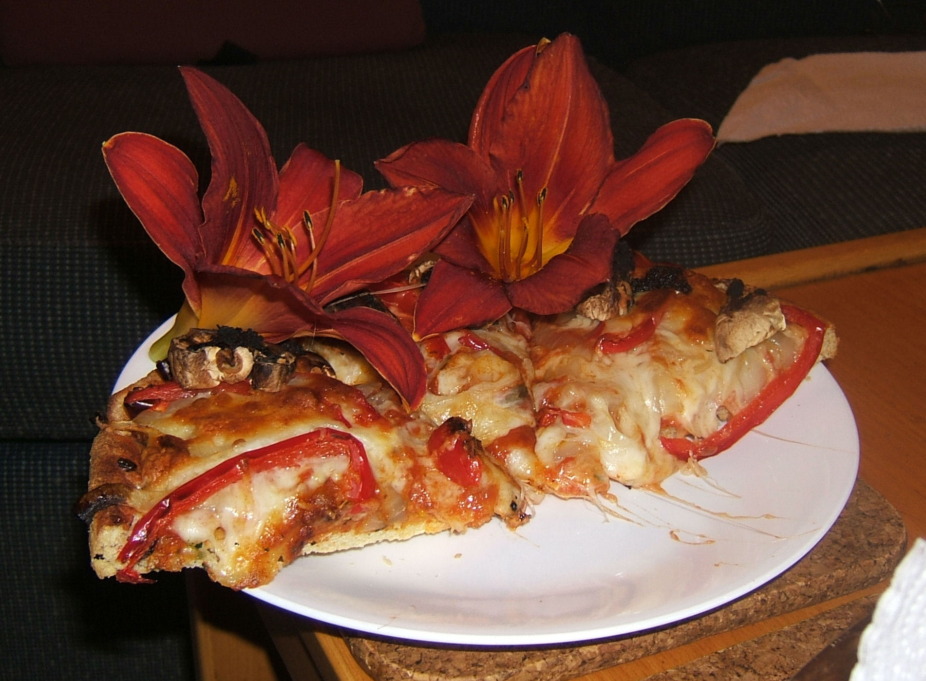 This year, I had it in mind to have a hemerocallis salad, but the menu plans didn’t fall into line, so tonight I decided to add the flowers to my pizza.  I will admit to eating the flowers before the pizza, but it was a very enjoyable meal.  A really beautful plate of food to be savoured.