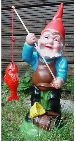 Certainly last week’s UK release of the movie “Gnomeo & Juliet” has given gnomes some media attention and may well lead to a revival in their popularity. The range of gnomes available today is much less than in their hey day, but there are figures available in all manner of sizes. Some like to relax after a hard day’s work in the garden, whilst others are ready to help out in the garden. But surely the eponymous image of a garden gnome is one fishing.