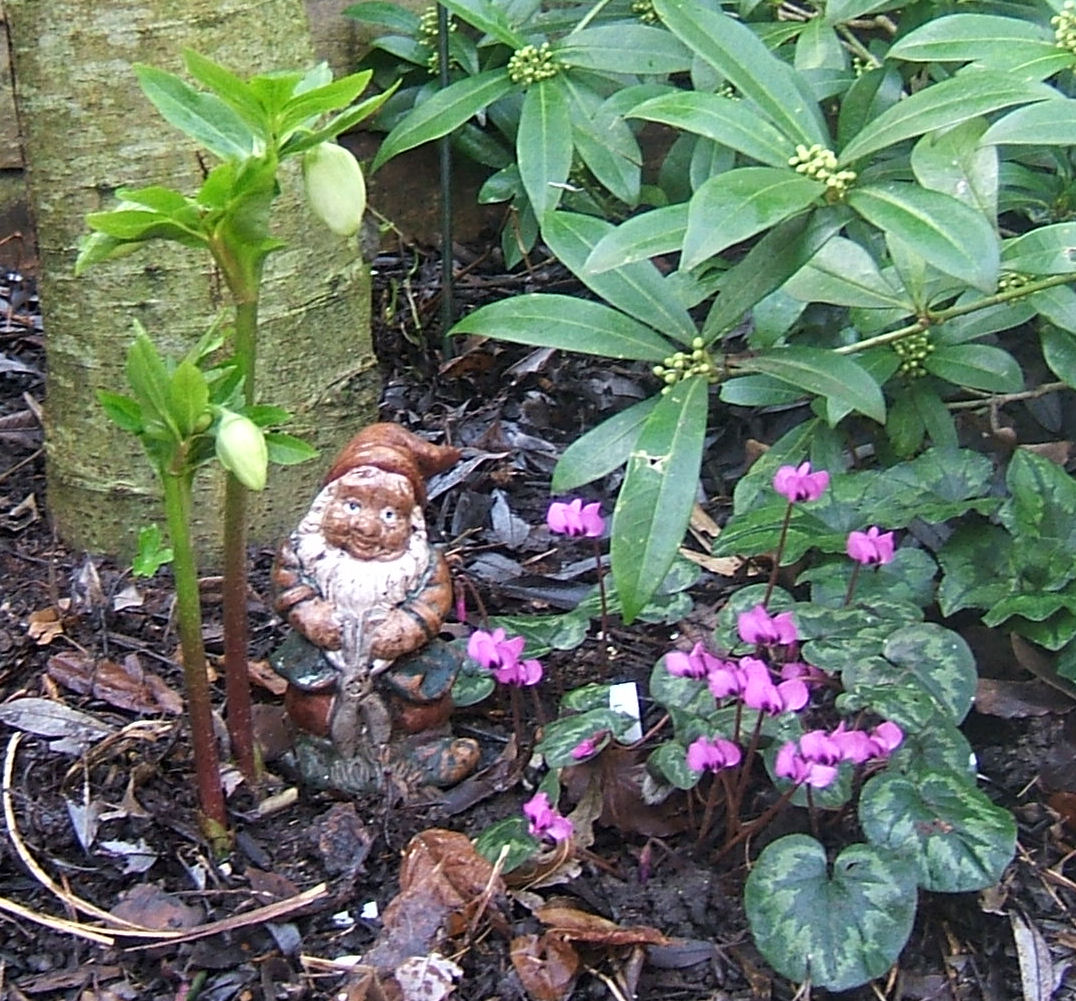 For years, I said that I didn’t want gnomes – they just felt out of place in my garden. A couple of my friends made it their business to find me a gnome that I was prepared to have in my garden. I have to say that they came up trumps and I agreed to find homes for both gnomes that I was presented with. When I wanted to photo one for this post, I had to go searching for them in the garden – they are small and well hidden! I managed to find the one above, who had fallen and was covered by some leaves. As you can see, his colours are muted, he has a very friendly face and he is prepared to help me out in the garden. I decided that for the photo I would move him to enjoy the cyclamen and wait for the hellebore to flower. Who knows, he may end up staying in his new location.