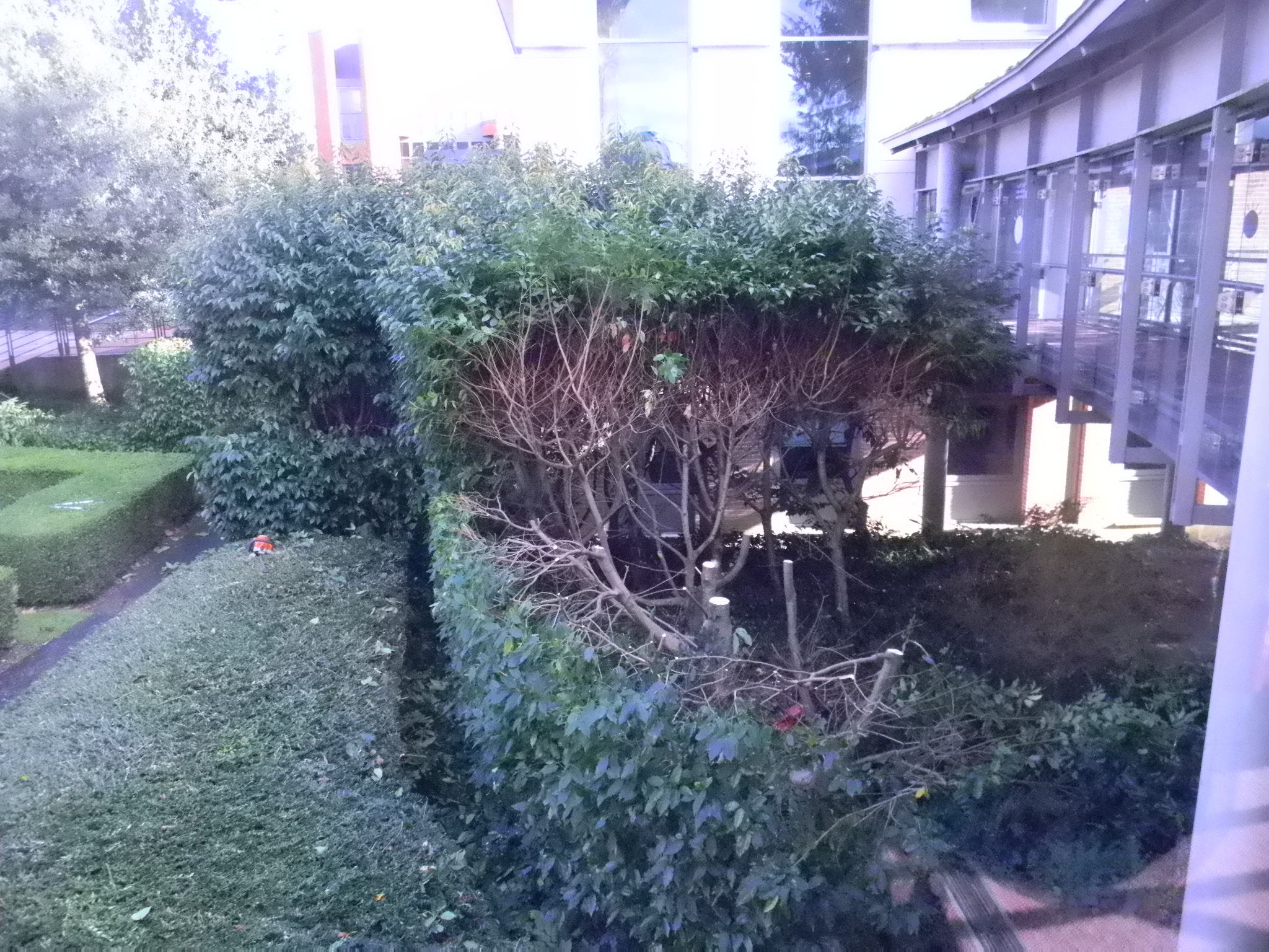 View from the walkway showing the drastic nature of the pruning (and some of the windows that will receive daylight again)