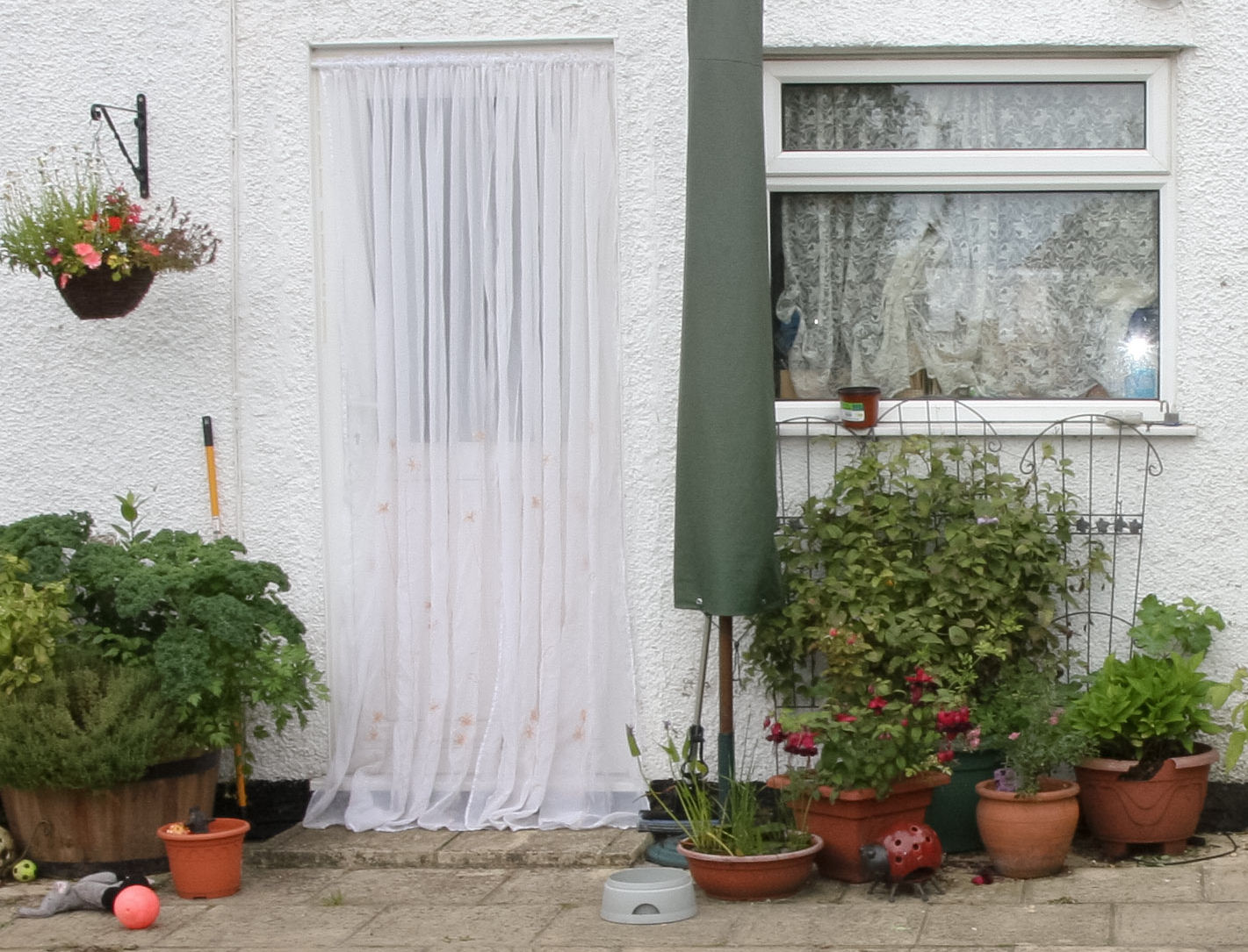 Outside the back door is a pot full of herbs which the family uses a lot.  On the other side is a clematis which only grows to a max of 4ft.  Mandy is growing a couple rose buses  with some success and trying a hanging basket for the first time which hasn’t been a success.