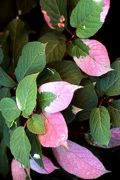 Actinidia – aka Kiwi. Best known for the multicoloured leaves of kolomitka which does not fruit. I am currently growing male and female deliciosa plants, which has large green almost furry leaves in the hope of getting fruit in a few years time. Sun, fertile, well drained soil, shelter from strong winds, frost hardy. |