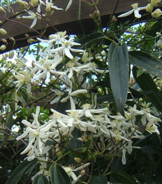 | Clematis – There are a huge variety of Clematis available. Spring flowering varieties include Alpina and Armandii. There is a wide range for Summer flowering from the big and blousy such as Fireworks to the more delicate, including doubles and some wonderful colours such as florida Sieboldii. In the autumn, there are still varieties of clematis in flower. Even in winter, the cirrhosas are in flower. The key thing about clematis is that their roots should be in shade, but their heads in sun. Virtually any garden will benefit from a variety of clematis. Preferably sun, fertile well drained soil, hardy to frost hardy.