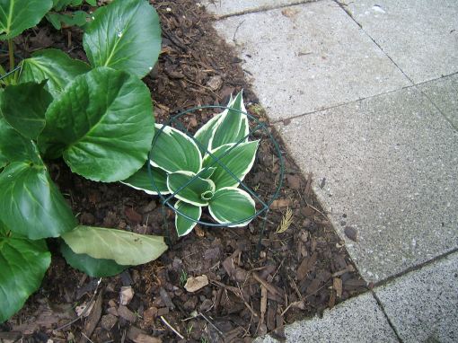 Other than that, I seem to have been very lucky. There are very few “holes” in my planting. There have been a few spots where I could put in an extra plant but really very few. Thank goodness the days of mass plant purchasing seem to be over. It wasn’t just the effect on my pocket, but rather the thought of having to dig holes and plant up to forty plants at a time. These days, it tends to be ten or less in one go. I bought three new hostas – this one has gone in a place that hisorically has not been good for plant survival. I’m not sure why it is, but the plant got immediate protection (the metal plant support), just in case it is the dogs that reduce my survival rates.