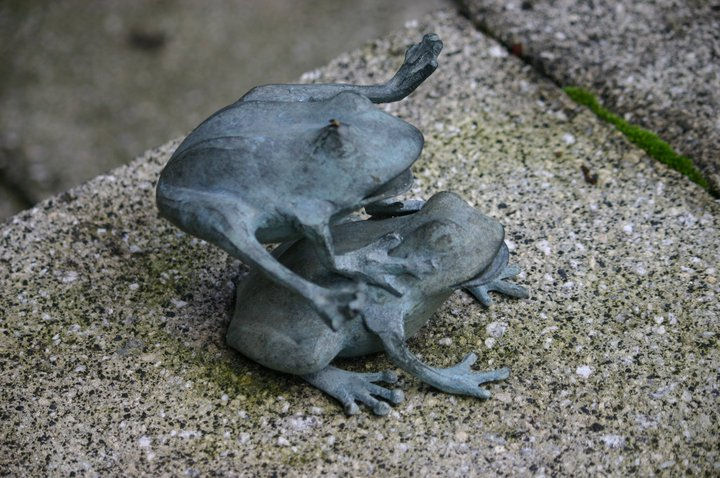 I love these frogs playing leapfrog – although some visitors are not always sure what they are doing – it depends on the angle they are viewed from.  I bought them in US and have never seen anything similar in UK.   I love the moss growing between the slabs that form the seat around the edge of the raised pond that is now their home.  I usually get rid of the moss whenever I pressure wash, despite wondering on many occasions whether I should leave it.  Maybe next time I will see if I can get the slabs clean whilst preserving the moss.