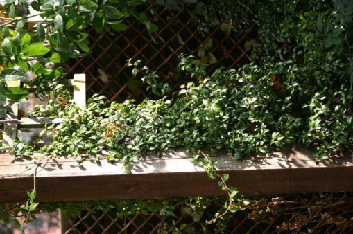 When I looked at this photo, I was really flummoxed.  I couldn’t think of where it could be – I don’t have a wooden bench anywhere in the garden.  I looked at the picture again and again and then I noticed the trellis in the background.  There is only one place in the garden where I have that sort of trellis.  I suddenly realised where the photo was taken.  Turned through 90°, the picture is a sideways on view of one of my Trachelospermum growing to create a green window.