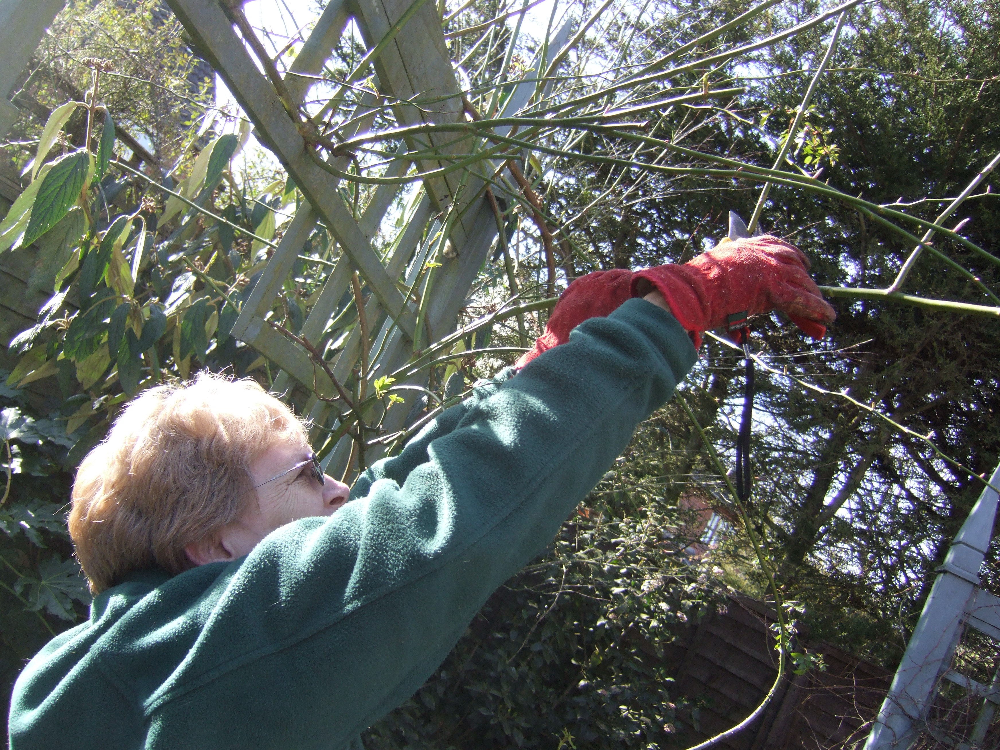 I love pruning as it brings order out of chaos. One example of this is the climbing rose that I train along the fence. First, I remove the shoots that were along the fence last year and then, I choose the longest new growth to bring down to cover the fence panel. This is a really good way to train climbing roses as not only are the flowers closer to one’s eye line, but also the horizontal stems produce more growth and therefore flowers. I have staples placed approptiately on the fence posts and tie the stems to them with plastic twine. I usually use green garden twine, but prefer the plastic for this job as it seems to have more “give” as the plant grows. The last job is to prune out the stems that aren’t long enough to be useful.