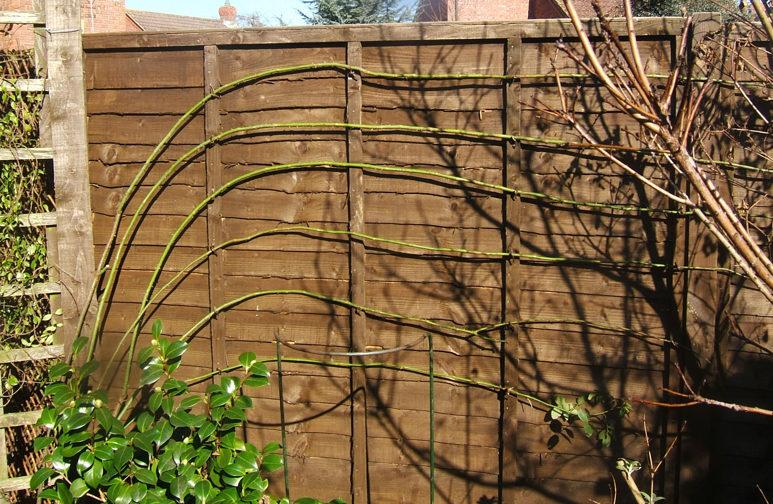 I love pruning as it brings order out of chaos. One example of this is the climbing rose that I train along the fence. First, I remove the shoots that were along the fence last year and then, I choose the longest new growth to bring down to cover the fence panel. This is a really good way to train climbing roses as not only are the flowers closer to one’s eye line, but also the horizontal stems produce more growth and therefore flowers. I have staples placed approptiately on the fence posts and tie the stems to them with plastic twine. I usually use green garden twine, but prefer the plastic for this job as it seems to have more “give” as the plant grows. The last job is to prune out the stems that aren’t long enough to be useful.